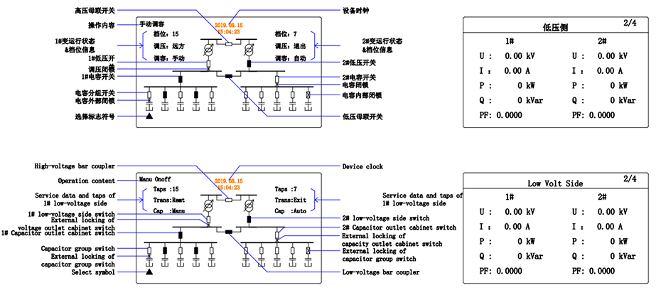 ●可针对两台变压器、两段母线自动判断运行方式,并控制 1-2 套电容器自动选择相应的调控决策。